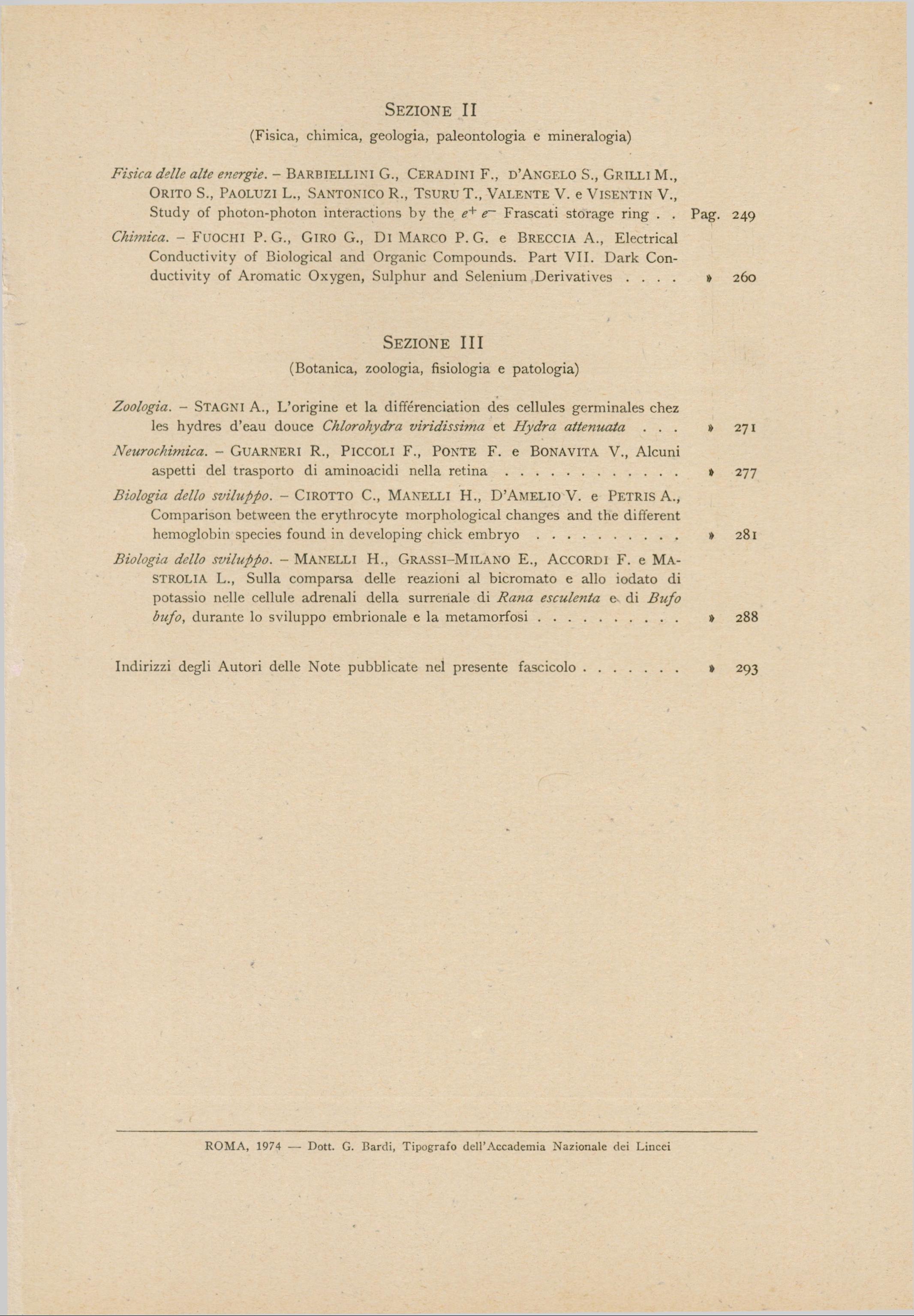 Sulla comparsa delle reazioni al bicromato e allo iodato di potassio nelle cellule adrenali della surrenale di Rana esculenta e di Bufo bufo, durante lo sviluppo embrionale e la metamorfosi, p. 288-292 (Italian)